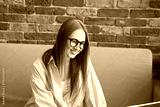 Young caucasian female with glasses smiling while using laptop on sofa against brick wall.