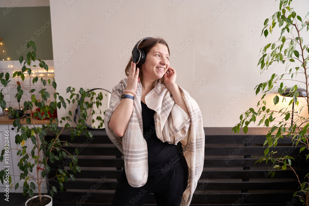 Caucasian young female enjoying music with headphones in cozy indoor space surrounded by plants.