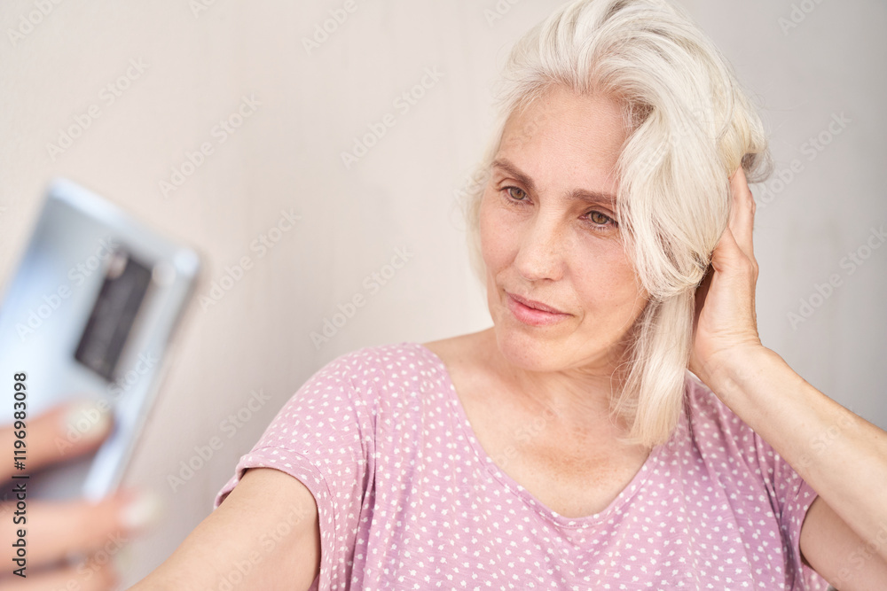 Elderly caucasian female taking selfie with smartphone in casual pink top.