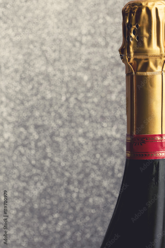 Champagne bottle against glitter background