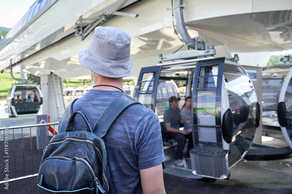 Caucasian male adult tourist observing cable car station with people boarding on a sunny day.