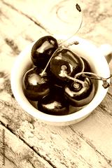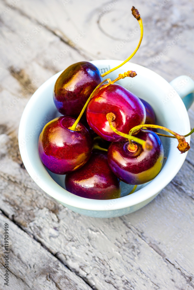 Stone Autumn fruit on the wooden table, ripe cherries, flat view.