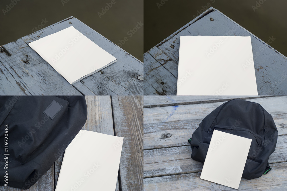 Mock up collage magazines and catalog on the table and a bench. Most realistic set covers on wood background.