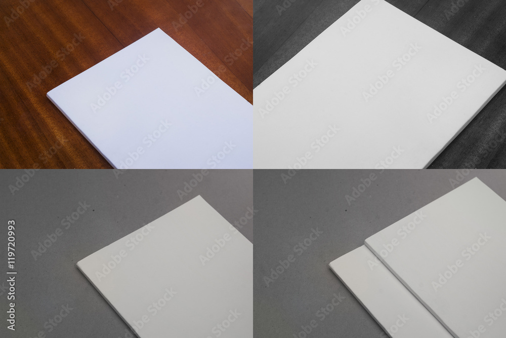 Mock up collage magazines and catalog on the table and a bench. Most realistic set covers on wood background.
