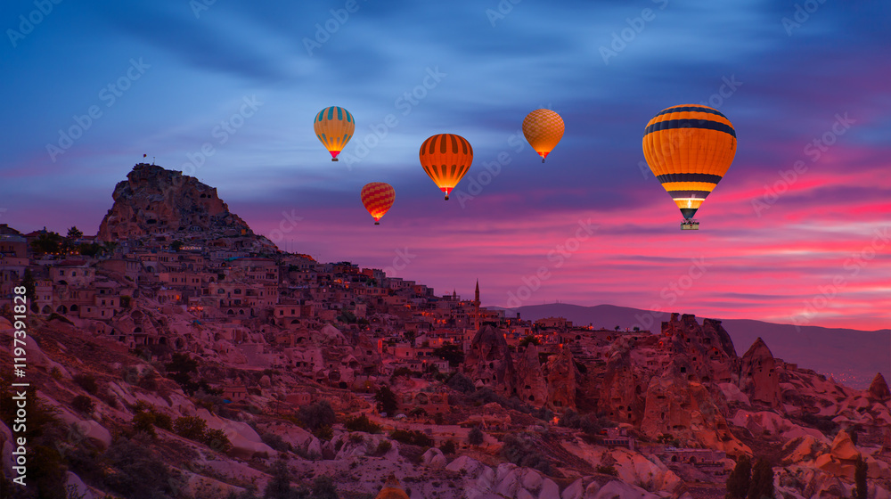 Hot air balloon flying over spectacular Cappadocia - Goreme, Turkey