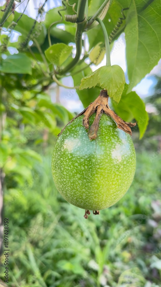 Green passion fruit, hanging on the plant - Passiflora edulis