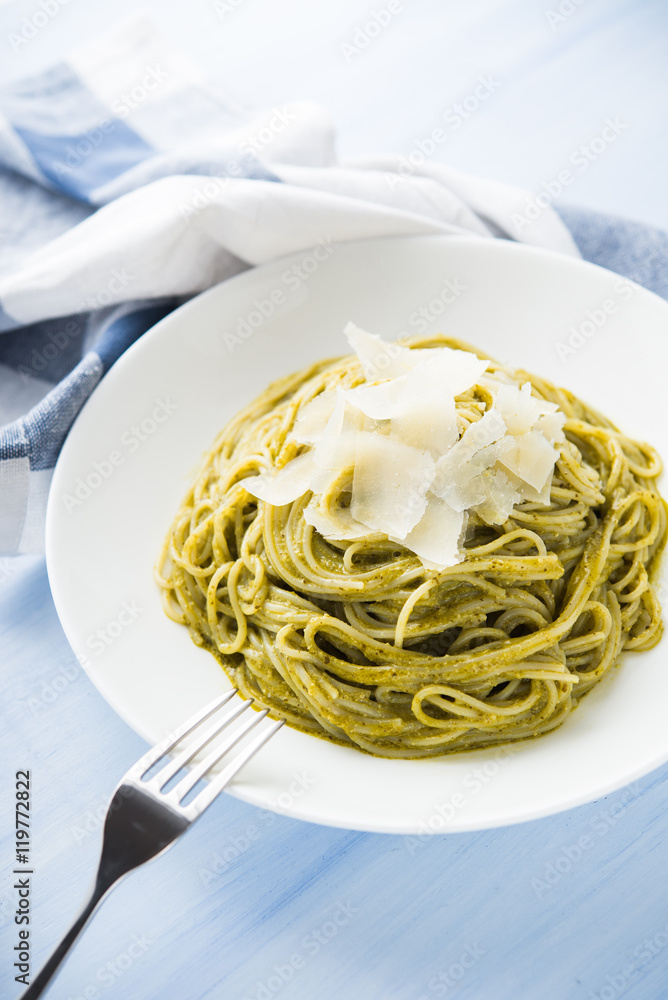 Pasta with pesto and parmesan on blue wooden background close up. Italian cuisine.