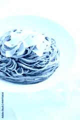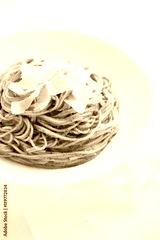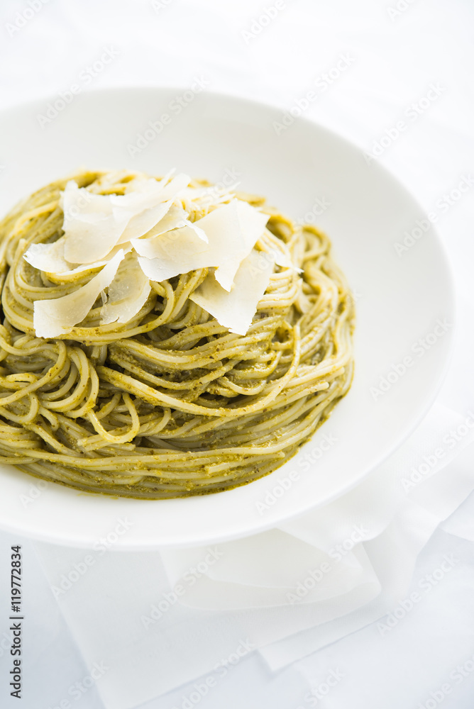 Pasta with pesto and parmesan on white background close up. Italian cuisine.