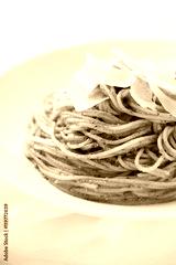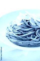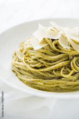 Pasta with pesto and parmesan on white background close up. Italian cuisine.