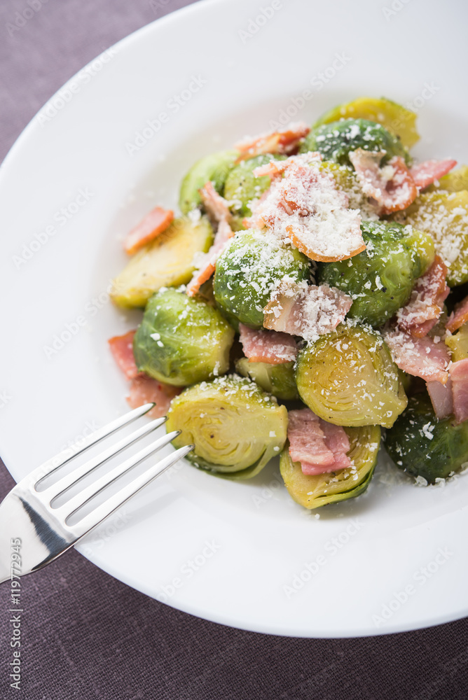 Brussels sprouts with bacon on dark background top view.