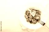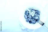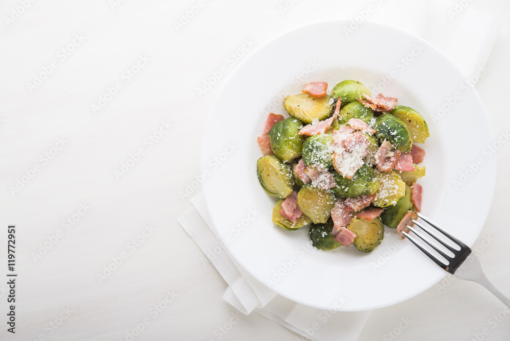 Brussels sprouts with bacon and parmesan on white background top view. Copy space.