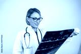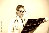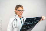Doctor, a beautiful woman, looking at an MRI picture, focused and attentive, facing the camera with a professional expression, wearing a lab coat in a medical setting.