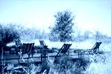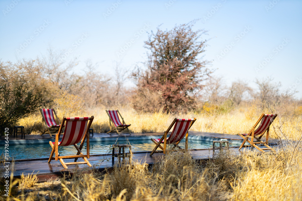 Safari lodge pool with deck chairs.