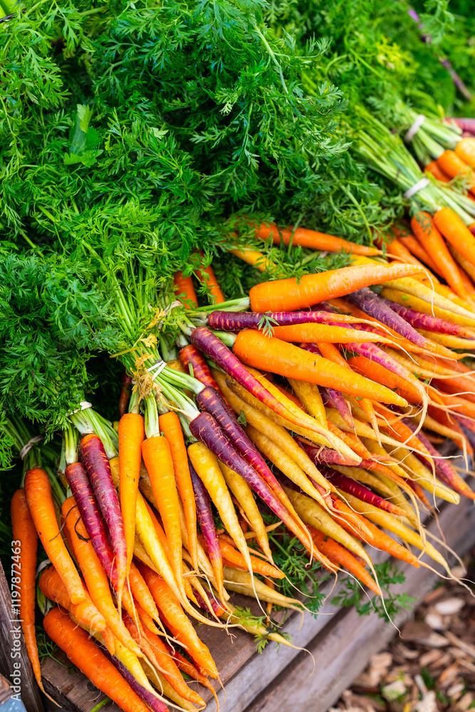 Fresh rainbow carrots with green tops at market