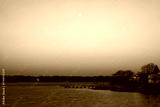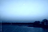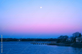 Seascape at Moonrise over the Buzzard Bay in Dartmouth, Massachusetts, USA: A pastel tone and color panoramic winter dawn landscape of New England of America