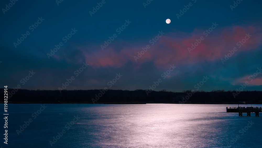 Dramatic Seascape with Stormy Clouds at Moonrise over the Buzzard Bay in Dartmouth, Massachusetts, USA: A winter dawn landscape of New England of America