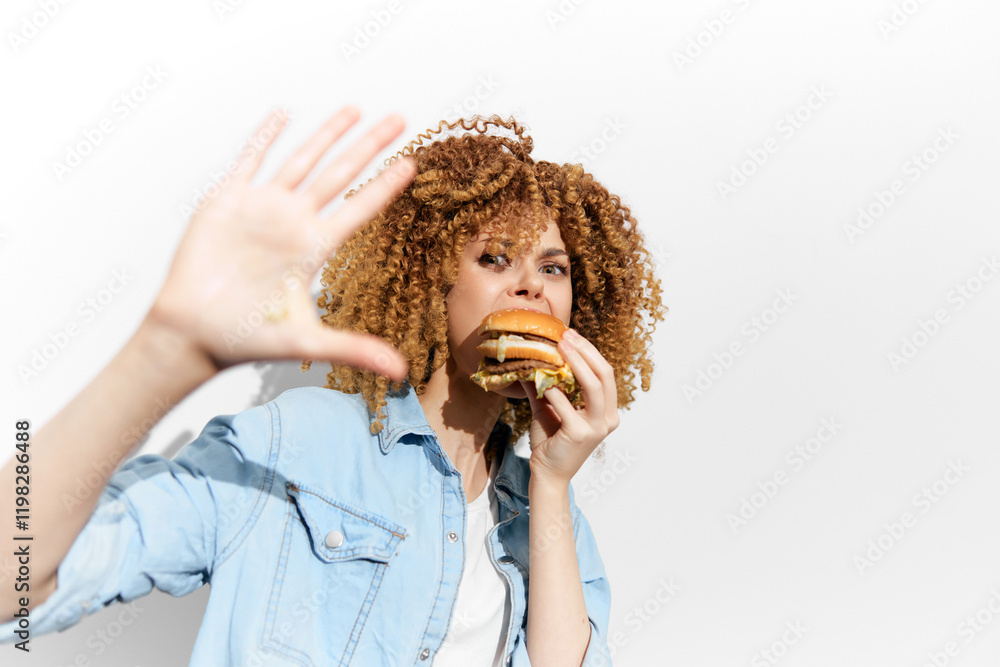 Young woman with curly hair holding a burger and refusing to eat, expressing a healthy eating concept, against a neutral background