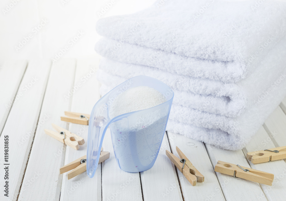 Bath towels, washing powder in measuring cup and wooden clothesp