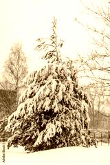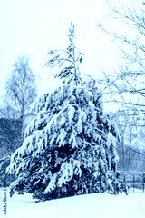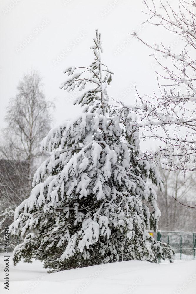 Spruce tree under a thick layer of snow after a snowfall