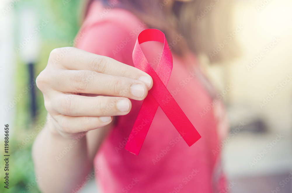 Close up woman showing red ribbon HIV, AIDS awareness ribbon, healthcare and medicine concept. retro effect.