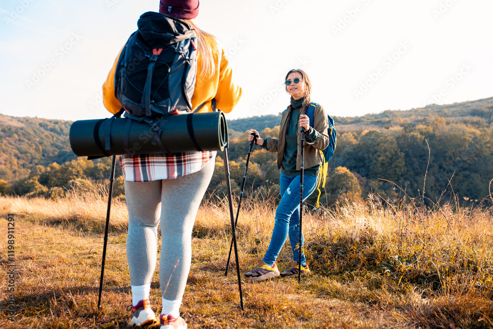 Two smiling woman hiking at top of the hill at meadow.