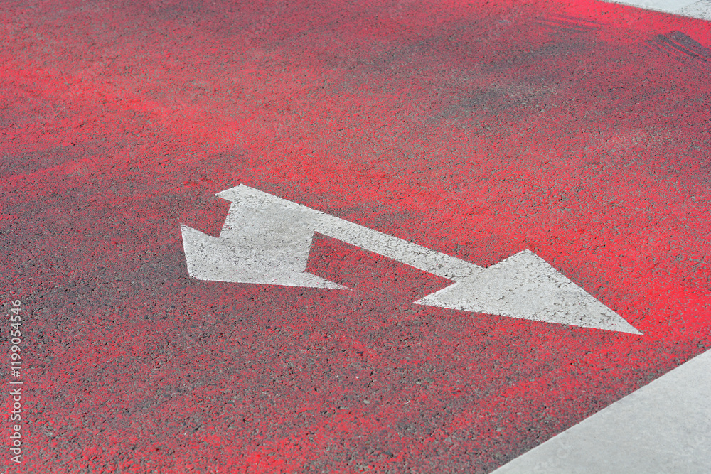 A double arrow on a red background on a bicycle lane, indicating directions right and straight