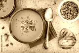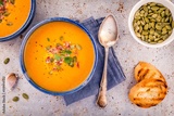 homemade autumn butternut squash soup with pumpkin seeds, bacon and basil