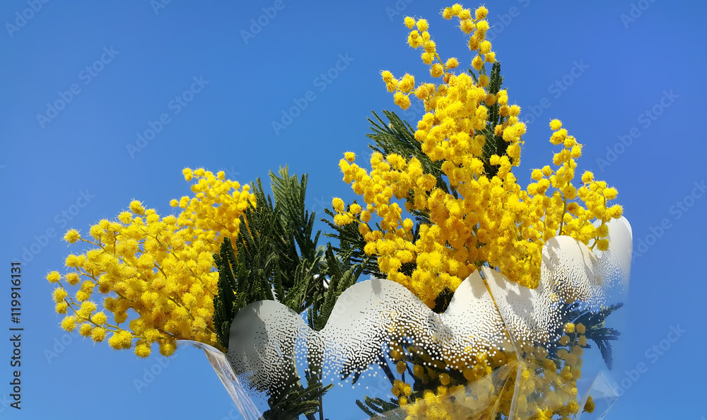 Branches of mimosa flower on bright blue background