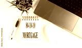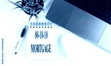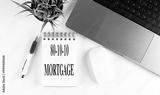 Notebook with the text 80-10-10 Mortgage next to a laptop, pen, mouse, and potted plant on a white desk