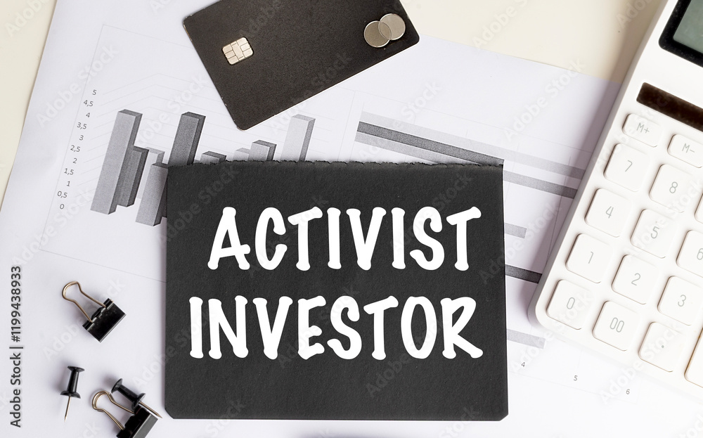 Black card with the text Activist Investor placed on financial charts, next to a credit card, calculator