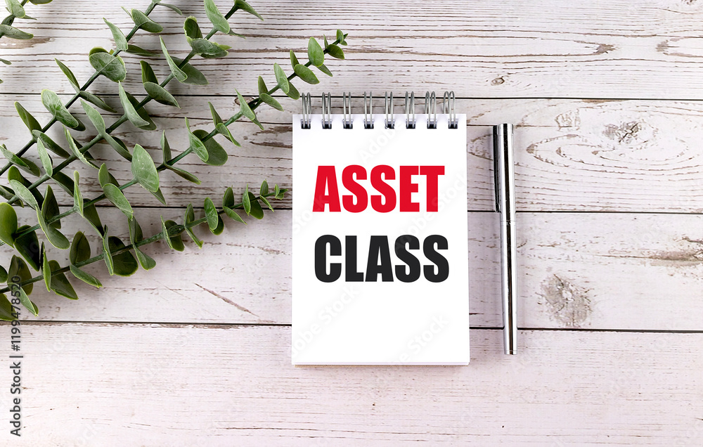 Notepad with the words asset class in bold red and black text on a white wooden background