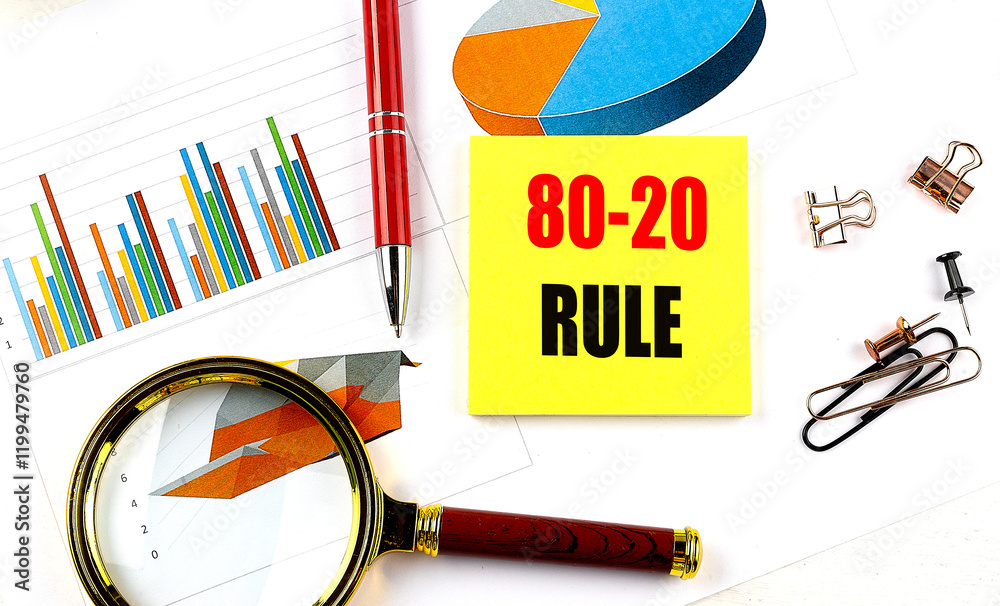 Yellow sticky note with the text 80-20 Rule placed on financial charts, surrounded by a red pen