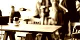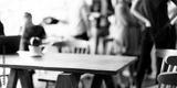Blurred image of a cafe with wooden tables and chairs. People in the background, socializing in cozy, relaxed atmosphere. Warm, inviting cafe. Empty wooden table in busy cafe, blurred background.