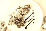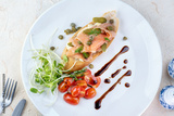 A beautiful plate of food with smoked salmon, capers, cream cheese, cherry tomatoes, microgreens, and balsamic vinegar.