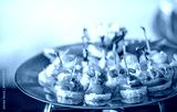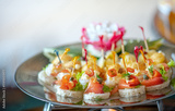 A silver platter with a variety of canapes, including smoked salmon, cream cheese, and cucumber.