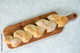 A beautiful braided loaf of bread sits on a wooden cutting board.