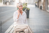40s mid age blond woman on the mobile phone talking and resting on bench in the city. Adult female talks on the smartphone phone.