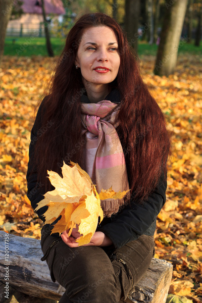 Girl on bench in autumn park.