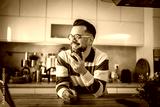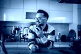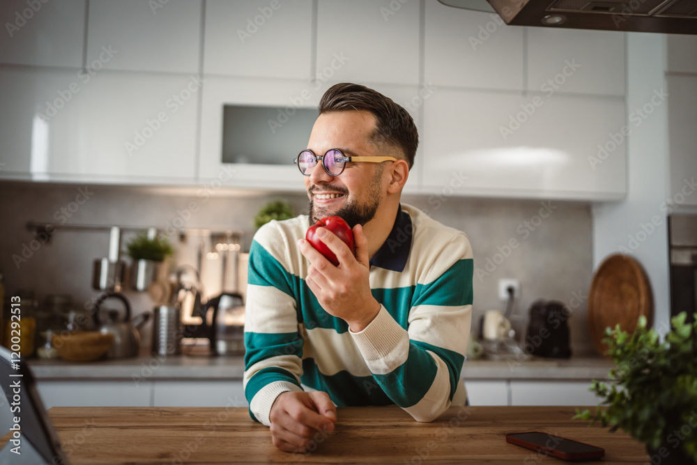 portrait of happy adult man eat apple for nutrition, healthy diet