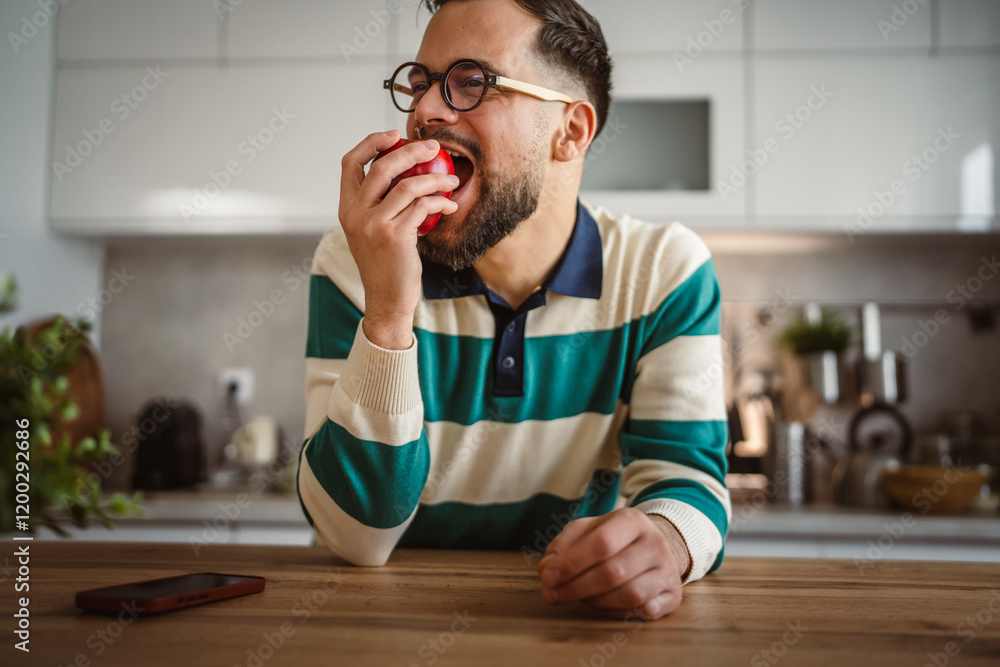 portrait of happy adult man eat apple for nutrition, healthy diet