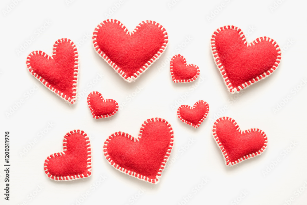 Red felt hearts. Handmade red hearts. Red hearts background. Valentine's Day background.