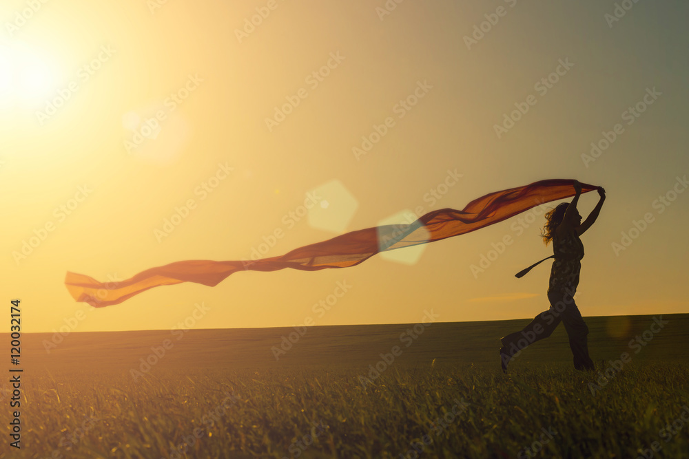Young woman running on a rural road at sunset in summer field. Lifestyle freedom sports background. Happiness concept.