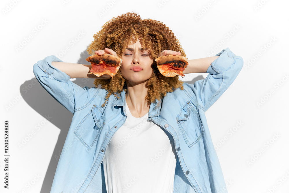 Young woman with curly hair, holding pizza slices, showing playful emotions in stylish denim outfit against a white background, representing joy and indulgence