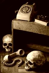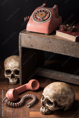 Still life photography : old telephone old book and dry rose with skull at foreground and background in nostalgia concept