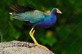 Purple Gallinule, Porphyrio martinicus, in the nature green march habitat in Sri Lanka. Rare blue bird with red head in the water grass with pink flower. Wildlife scene from Costa Rica. Bird in water.