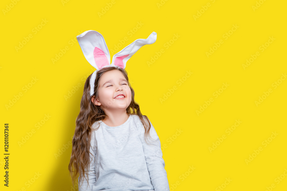 Cute little child girl wearing bunny ears on Easter day. Easter day. Girl with Easter eggs and live white bunny in studio on yellow background. isolated
