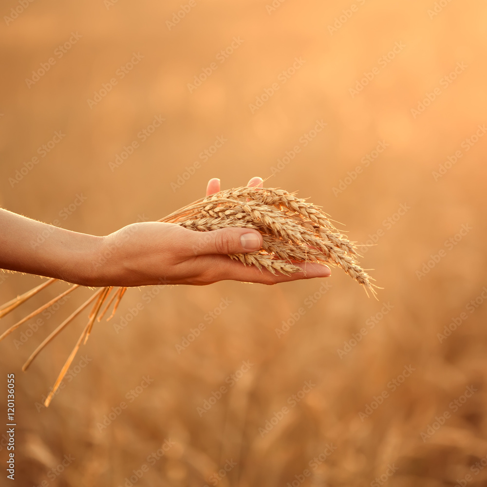 Woman's hand hold wheat ears at sunset. Shallow depth of field.
