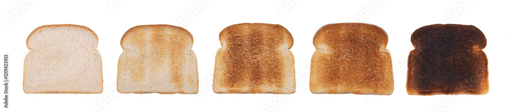 Toast in line from less toasted to more toasted isolated on a cut out PNG transparent background