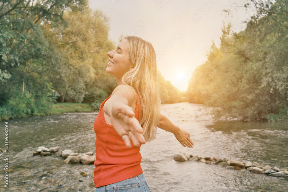 Woman Cools Off in a Mountain River on a Hot Summer Day. Woman Enjoys the Refreshing Waters on a Scorching Day. Refreshing Escape. Cooling Off in a Mountain River.