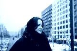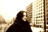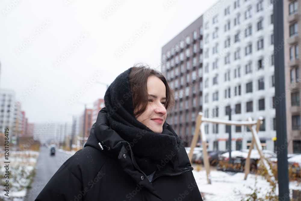 Young woman in the city, happy teen walking on a snowy sidewalk, modern fashion and street background.